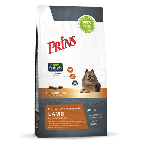 Protection Croque Lamb Hypoallergenic is een krokante voeding voor volwassen honden van kleine rassen met een gevoelige spijsvertering, huid en vacht. Deze volledige voeding bevat één eiwitbron (lam), wat honden met een gevoelige huid en vacht ondersteuning biedt. Zorgvuldig geselecteerde ingrediënten als zalmolie, FOS, probiotica, kruidenextracten en Schüssler celzouten dragen daarnaast bij aan een gezonde hartfunctie, soepele gewrichten en een gezonde huid en glanzende vacht.