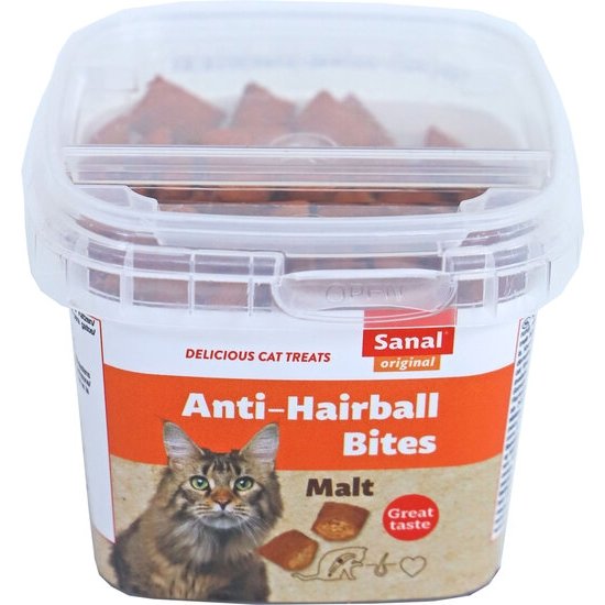 Sanal Malt Anti-Haarbal Bites is speciaal ontwikkeld om haarballen te helpen verminderen en te verwijderen. Het is een lekkere traktatie voor je kat. Krokant aan de buitenkant, met een zachte vulling met malt pasta. Malt helpt de vorming van haarballen tegen te gaan. Verpakt in een handige en hersluitbare cup waardoor het product langer vers blijft.