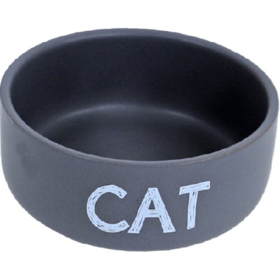 Boon katten eetbak aardewerk mat grijs met aan de buitenzijde CAT en een doorsnee van 12 cm.