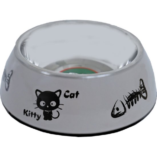 Katteneetbak plastic/RVS voor de kat. De binnenkant van de bak bestaat uit een RVS bakje dat vaatwasser bestendig is en aan de onderzijde is een antisliprand bevestigd. De bak is taupe van kleur en heeft “kitty” en “cat” in zwarte letters erop staan en in het zwart katten en vissengraten als decoratie.