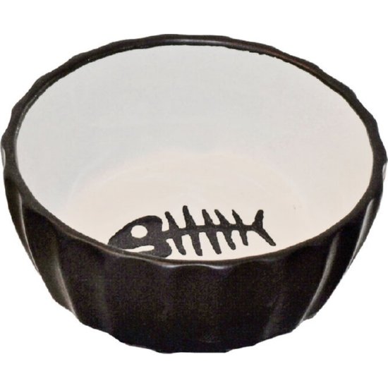 Een mooie, zwarte katteneetbak met mat design en een stoere vissengraat print in het bakje. Het bakje heeft een diameter van 11cm.