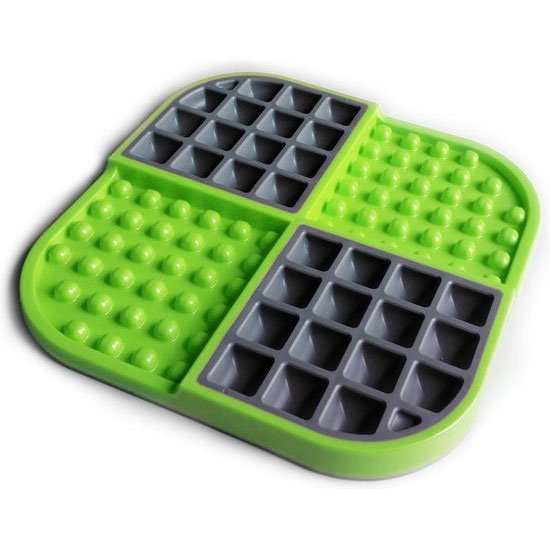 De Licki Mat Slomo, de naam zegt het al, is ideaal te gebruiken als anti schrok voedermiddel. De Slomo is ontworpen voor voor het serveren van zowel nat als droog voer tegelijk! Minder calorieën, gezonde lekkernijen en een langere etensduur zorgen ervoor dat uw hond om een verantwoorde manier zijn of haar voedsel toegediend krijgt. De oppervlakken bevorderen het likken van uw hond, wat helpt om speeksel te genereren. Dit draagt weer bij aan een betere spijsvertering. Het rubberen oppervlak schraapt ook voedseldeeltjes en geur veroorzakende bacteriën van de tong van uw huisdier, wat een frissen adem bevordert. Wordt geleverd in de afmeting 20×20 cm . Is gemaakt van non toxic voedingswaarde TPR en gerecycled polypropyleen.