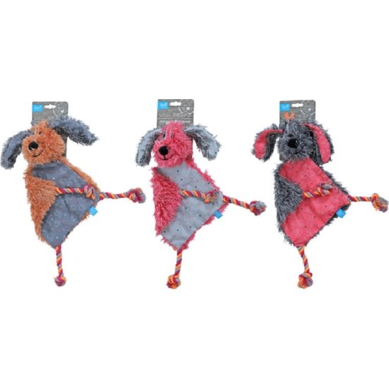 Lief! Girlz hondenspeelgoed teckel plat met piep, plat hondenspeeltje van stof en pluche in de vorm van een hondje met Girlz details. Floss-touw op 3 hoeken en een hondenkop waar een piepgeluid in is verwerkt, waardoor uw hond of puppy er nog liever mee zal willen spelen!