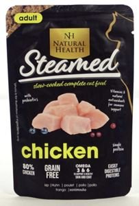 De pouches van Natural Health zijn langzaam gestoomde complete maaltijden, en hebben een hoog percentage dierlijk eiwit. Tevens voorzien van voldoende vitamines, prebiotica en natuurlijke anti-oxidanten. Omega 3 & 6 ondersteunen een gezonde huid en vacht.