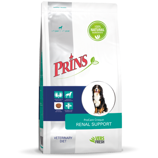 Chronisch nierfalen komt regelmatig voor, vooral bij wat oudere honden. Een nierondersteunende dieetvoeding heeft een positieve invloed op de nieren en kan de achteruitgang van de nierfunctie vertragen. Prins ProCare Croque Veterinary Diet Renal Support is een volledige voeding speciaal voor honden met chronisch nierfalen.