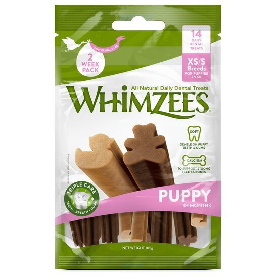 Een gezonde puppy heeft een gezond gebit nodig. Het gebit bestaat uit kleine snijtanden, scherpe hoektanden en sterke kiezen. Een gebit dat niet wordt verzorgd kan leiden tot tandplak, tandsteen en ontstekingen aan het tandvlees. Met Whimzees kauwsnacks zorg je voor een gezond gebit en krijgt je hond een verantwoord tussendoortje. Eén zo’n snack is deze Puppy Voordeelverpakking XS/S, geschikt voor puppy’s van 2 tot 9 kg. Deze snacks zijn speciaal voor puppy’s gemaakt en zijn zachter dan Whimzees snacks voor volwassen honden.
